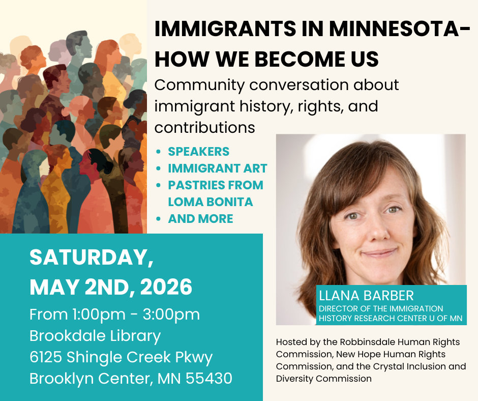 The New Hope Human Rights Commission invites you to attend Immigrants in Minnesota- How We Become Us on Saturday, May 2 from 1-3PM! Enjoy pastries from Loma Bonita, observe immigrant art, and listen to speakers discuss immigration history, rights, and contributions.