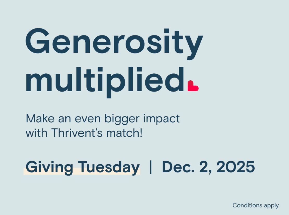 *Donations made online to featured organizations through Thrivent’s giving platform and at in-person events on Giving Tuesday, Dec. 2, 2025, will be matched $1 for every $2 donated up to $20,000 per Thrivent Member Network. Thrivent will pay up to $300,000 in online processing fees per calendar year for personal donations made through Thrivent’s online giving platform.